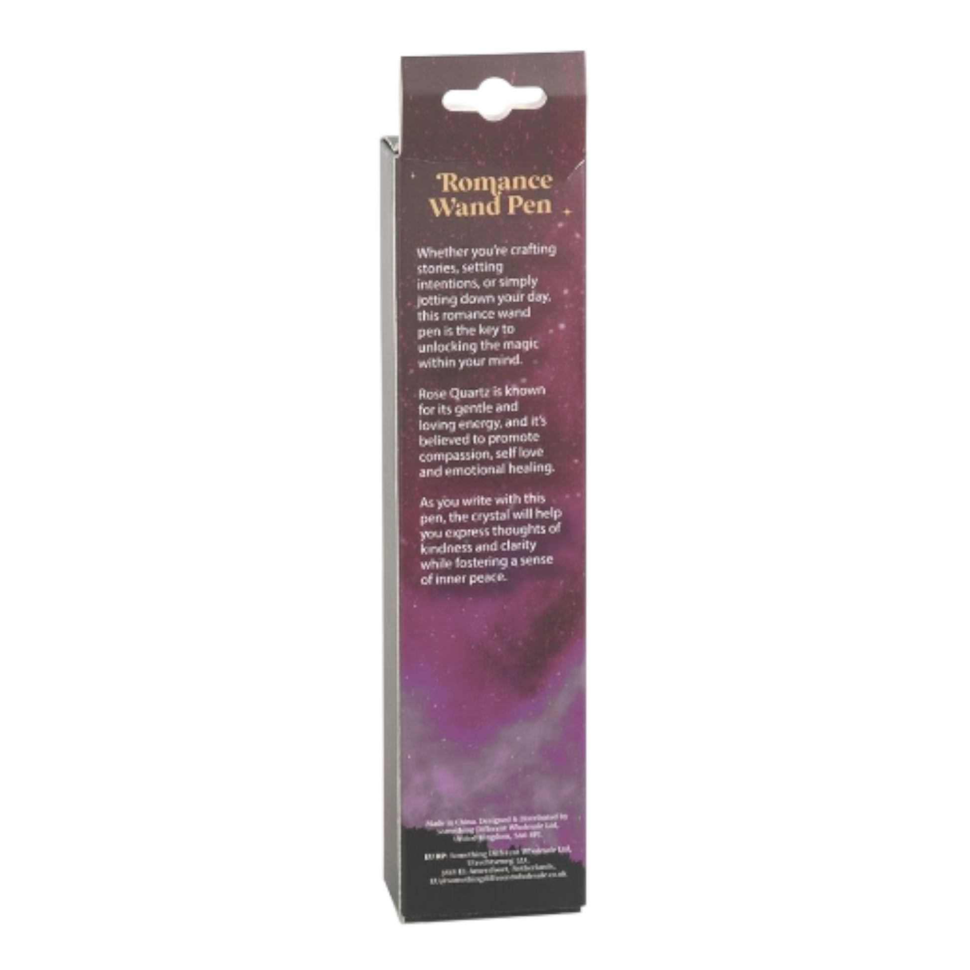 Whether you're crafting stories, setting intentions, or simply jotting down your day, this romance wand pen is the key to unlocking magic within your mind. The pen features a beautifully crafted magic wand design, finished with a genuine rose quartz crystal to promote compassion, self-love and emotional healing. The crystal will help express thoughts of kindness and clarity while fostering a sense of inner peace. Packaged in a matching gift box with moon phase and star designs.